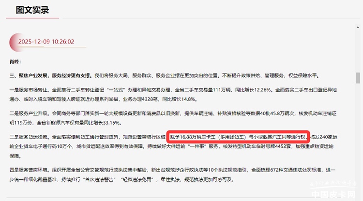 2025年12月9日,云南省人民政府新闻办公室在云南海埂会堂举行道路交通安全管理工作专题新闻发布会。会上宣布,云南省已正式赋予全省16.88万辆皮卡车(多用途货车)与小型载客汽车同等的城市道路通行权,标志着皮卡进城限制在云南全面放开。